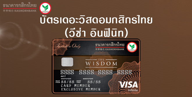 บัตรแรก บัตรเดอะวิสดอมกสิกรไทย (วีซ่า อินฟินิท) ที่สุดของเอกสิทธิ์เหนือระดับสำหรับการใช้ชีวิตที่สมบูรณ์แบบ ไม่ว่าจะเป็นเรื่องของธุรกรรมทางการเงิน การเดินทางและท่องเที่ยว การใช้ชีวิตในไลฟ์สไตล์ต่างๆ บัตรนี้สำหรับผู้มีเงินฝากและเงินลงทุนตั้งแต่ 150 ล้านบาทขึ้นไป รวมกันเฉลี่ย 6 เดือน และที่สำคัญ ต้องเป็นผู้ที่ได้รับการเรียนเชิญจากธนาคารเท่านั้น