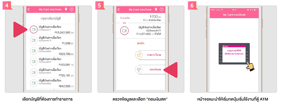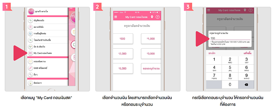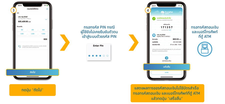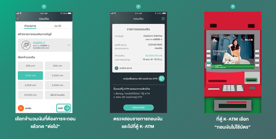 - การถอนผ่านแอปพลิเคชั่น และรับเงินที่สาขาของธนาคาร