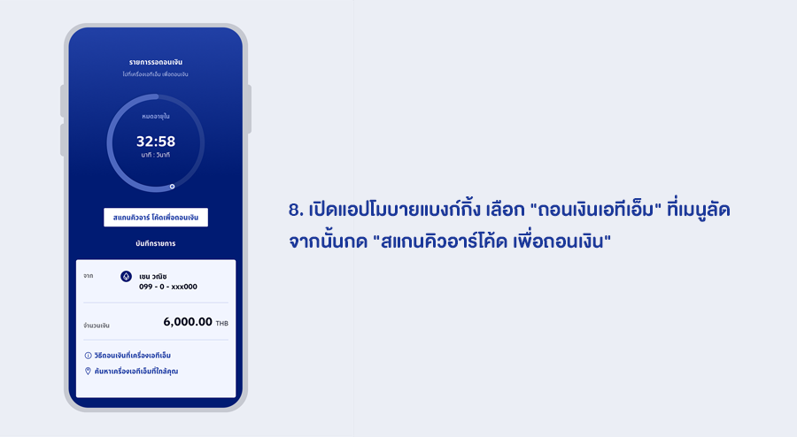 - รหัสถอนเงินมีอายุไม่เกิน 15 นาที นับจากเวลาที่รหัสถูกสร้างขึ้นมา