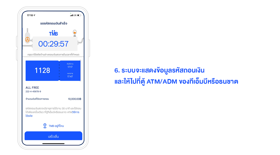 - รหัสถอนเงินมีอายุการใช้งาน 30 นาที นับตั้งแต่ได้รับรหัส