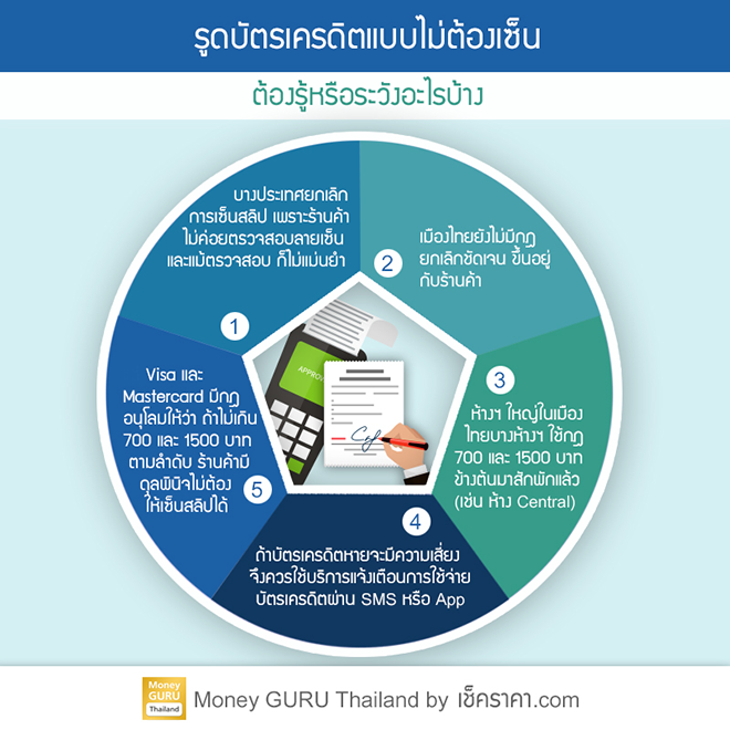 ในประเทศไทยไม่ว่าจะเป็นในห้างสรรพสินค้าหรือซูเปอร์มาร์เก็ต เริ่มมีการรูดซื้อสินค้าหรือบริการผ่านบัตรเครดิต และไม่ต้องเซ็นสลิปให้เห็นกันบ้างแล้ว เช่น Big C, Central เรามาดูกันค่ะว่าวิธีการแบบนี้มีข้อดี และข้อพึงระวังอะไรบ้าง...