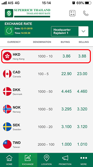อัตราแลกเปลี่ยนของวันที่ 12 พฤศจิกายน 2562 (กรณีที่เราต้องการไปแลกเงิน ต้องดูที่ด้าน "Selling" หรือ "ราคาแลกซื้อ") อัตราแลกเปลี่ยนสกุลเงิน HKD ทั้งของ TMB All Free และ Superrich เด้งกลับมาสูงกว่าเมื่อวันที่ 23 ตุลาคม 2562 เล็กน้อยค่ะ โดยอัตราแลกเปลี่ยนของ TMB All Free อยู่ที่ 3.888610 และอัตราแลกเปลี่ยนของ Superrich อยู่ที่ 3.88 ค่ะ ซึ่งหากแลกเงินที่ Superrich ก็จะประหยัดกว่าแลกกับ TMB All Free เล็กน้อยค่ะ