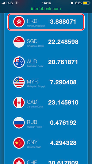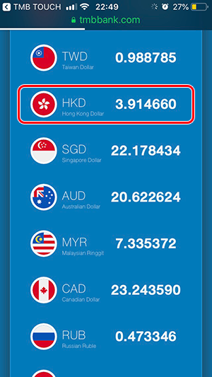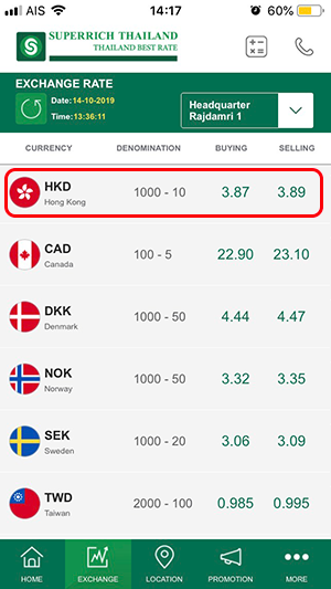 อัตราแลกเปลี่ยนของวันที่ 3 ตุลาคม 2562 (กรณีที่เราต้องการไปแลกเงิน ต้องดูที่ด้าน "Selling" หรือ "ราคาแลกซื้อ") อัตราแลกเปลี่ยนสกุลเงิน HKD ของ TMB All Free อยู่ที่ 3.914660 ส่วนอัตราแลกเปลี่ยนของ Superrich อยู่ที่ 3.91 ค่ะ เช่น ถ้าเราต้องการแลกเงินฮ่องกง 5,000 เหรียญ
