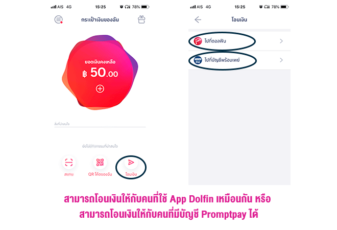 โอนเงินสามารถโอนไปได้ 2 กลุ่มหลักๆ คือ คนที่ใช้แอปฯ Dolfin เหมือนกันโดยกรอกแค่เบอร์โทรศัพท์ และจำนวนเงิน และอีกกลุ่มคือ คนที่มีบัญชี Promptpay ซึ่งไม่จำกัดธนาคาร ส่วนการเติมเงิน ทำได้หลายวิธี ทั้งการผูกกับ Mobile Banking ของธนาคาร หรือเติมเงินสดผ่านที่เคาน์เตอร์ CenPay ของกลุ่มเซ็นทรัลกว่า 1,900 สาขาทั่วประเทศ