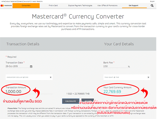ยกตัวอย่างหากเรากำลังจะเดินทางไปประเทศสิงคโปร์ แล้วมีความจำเป็นต้องกดเงินสดจากบัตร ในวันที่ 29 ตุลาคม 2562 เราลองคำนวณกันเล่นๆ นะคะว่า จะกดเงินสดจากบัตรเดบิต หรือบัตรเครดิต บัตรไหนจะคุ้มกว่ากัน และก่อนที่เราจะมาคำนวณค่าธรรมเนียมต่างๆ เราเข้าไปทำ Current Convert กันก่อนค่ะ ในตัวอย่างนี้จะใช้อัตราแลกเปลี่ยนจาก MasterCard โดยสามารถเข้าไปคำนวณได้ที่ www.mastercard.us และใส่รายละเอียด เช่น ต้องการ Convert อัตราแลกเปลี่ยน 1,000 SGD เป็น THB และมีค่าความเสี่ยงในการเปลี่ยนแปลงสกุลเงิน 2.5% ตามภาพด้านล่างค่ะ