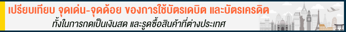 | บัตรเครดิต (Credit Card) | 1.เป็นการใช้จ่ายจากวงเงินที่ธนาคาร หรือบริษัทบัตรเครดิตให้ โดยไม่ต้องสำรองเงินของตัวเองไว้ในบัตร 2.ได้รับสิทธิประโยชน์ของบัตรเครดิตที่แฝงอยู่ เช่น คะแนนสะสม 3.มีสิทธิประโยชน์ได้รับการคุ้มครองประกันภัยการเดินทางฟรี 4.ไม่ต้องกังวลเรื่องเหลือเงินเป็นเศษเหรียญกลับมา แล้วจะแลกเงินกลับคืนไม่ได้ | 1. กรณีกดเงินสดออกมาใช้จ่าย สำหรับบัตรเครดิต จะต้องเสียค่าธรรมเนียมต่างๆ ดังนี้ค่ะ 1.1 ต้องจ่ายค่าความเสี่ยงในการเปลี่ยนแปลงสกุลเงินไม่เกินร้อยละ 2.5 จากยอดค่าใช้จ่ายที่เราใช้ไป 1.2 ค่าธรรมเนียมในการกดเงินสดจากบัตรเครดิต 3% และบวก VAT อีก 7% ของยอดที่เรากดออกมา 1.3 อัตราดอกเบี้ยของบัตรเครดิตสูงสุด 18% ต่อปี โดยธนาคารจะคิดดอกเบี้ยเป็นรายวัน เริ่มจากวันที่กดเงินออกมา จนกว่าเราจะชำระครบตามยอด 1.4 ค่าธรรมเนียมการกดเงินที่ตู้ ATM อีก 100 บาท เช่นเดียวกับการกดเงินด้วยบัตรเดบิต 2. กรณีใช้บัตรรูดซื้อสินค้า 2.1 ถ้าจ่ายเป็นเงินบาท ต้องจ่ายอัตราแลกเปลี่ยน 2 ต่อ เช่น หากเราใช้บัตรเครดิตที่ออกโดยธนาคารในไทย ไปรูดซื้อของเป็นเงิน JPY ธนาคารจะแปลงสกุลเงิน ดังนี้ JPY>>USD และ USD>>THB 2.2 ต้องจ่ายค่าความเสี่ยงในการเปลี่ยนแปลงสกุลเงินไม่เกินร้อยละ 2.5 จากยอดค่าใช้จ่ายที่เราใช้ไป 3.ต้องคอยระวังการใช้จ่ายที่เกินตัว ช้อปเพลินจนลืมไปว่ากลับมาต้องจ่ายยอดหนี้ทั้งหมดด้วย |