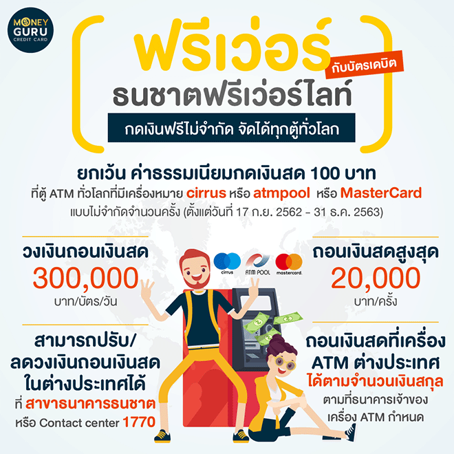 และสำหรับใครที่กังวลว่าถ้าใช้บัตรเดบิตกดเงินสดที่ต่างประเทศแล้วจะเสียค่าธรรมเนียม ต้องขอบอกเลยว่า ตอนนี้บัตรเดบิตธนชาตฟรีเว่อร์ไลท์ จากธนาคารธนชาต มีโปรโมชั่น ยกเว้น ค่าธรรมเนียมกดเงินสด 100 บาท ที่ตู้ ATM ทั่วโลก ที่มีเครื่องหมาย cirrus
