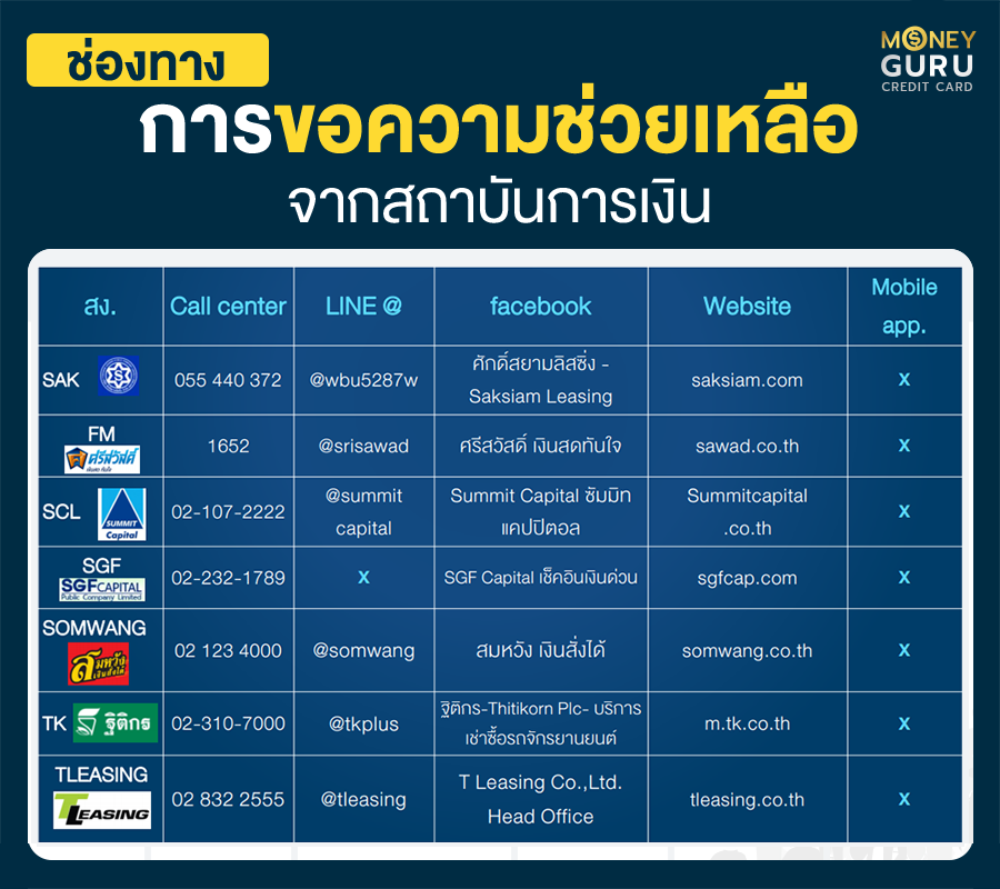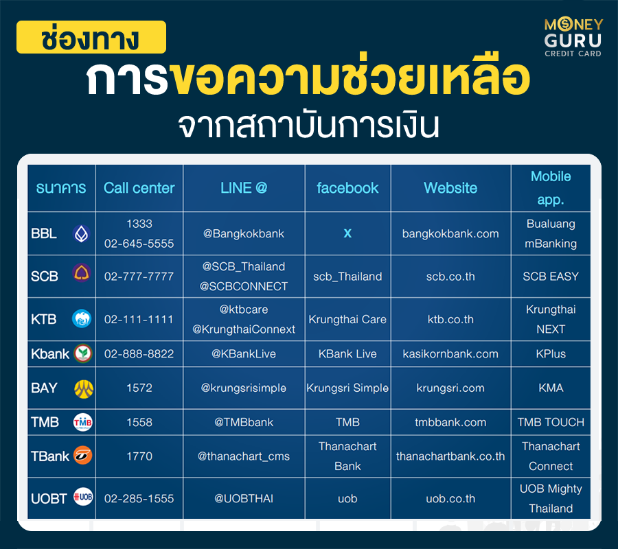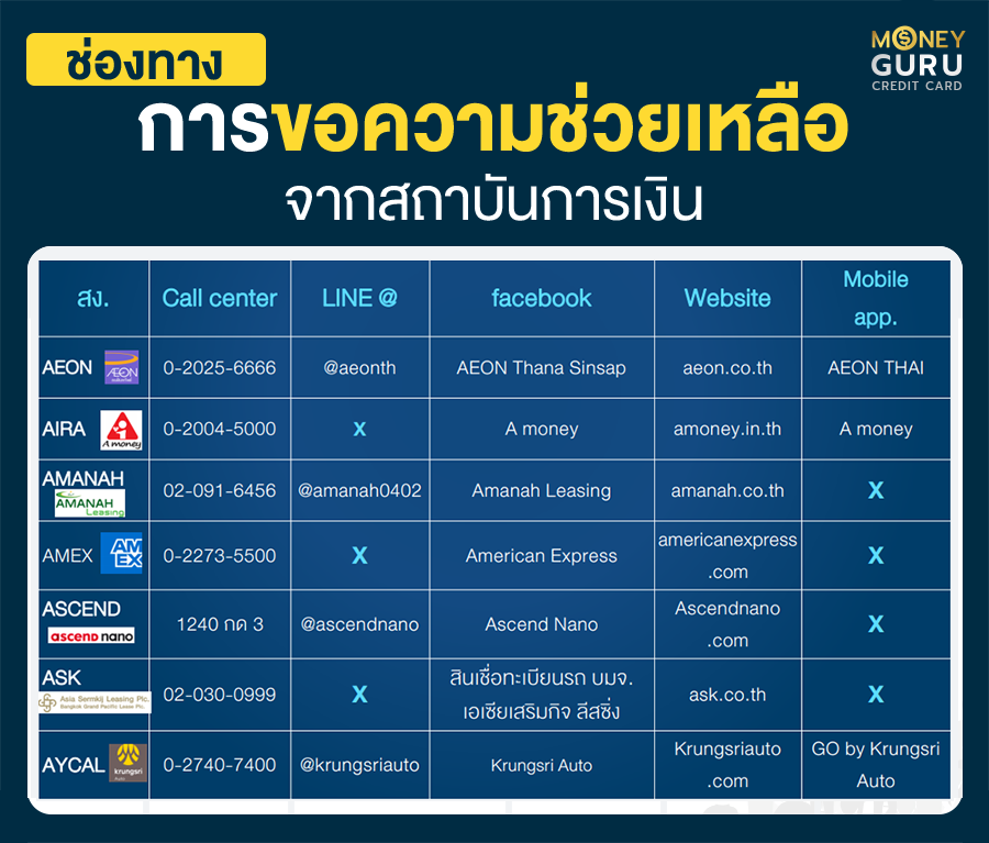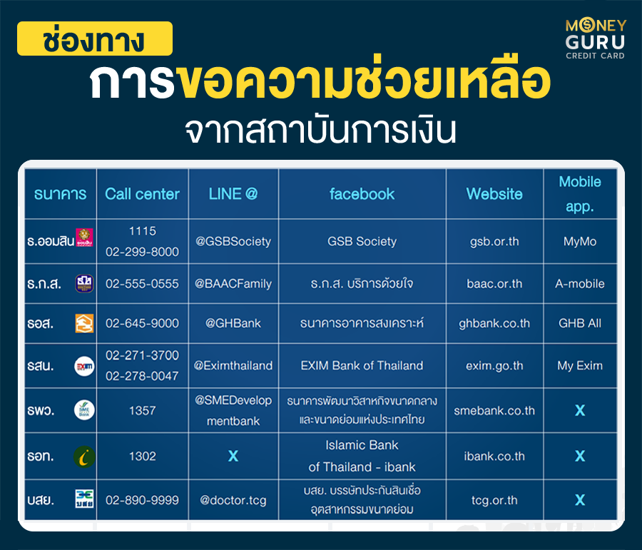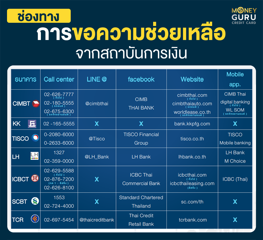 มาตรการการช่วยเหลือที่ออกมานั้น โดยปกติแล้วเป็นมาตรการที่ออกมาช่วยเหลือคนที่มีหนี้ปกติ และเป็นหนี้บัตรเครดิตที่ยังไม่เป็นหนี้ค้างชำระเกินกว่า 90 วัน (ยังไม่เป็น NPL) เพราะฉะนั้น จะมีคำถามต่อเนื่องมาว่า แล้วถ้าเป็นหนี้ที่ติดเครดิตบูโร หรือเป็น NPL จะขอความช่วยเหลือได้มั้ย? ต้องทำยังไง?...จากคำถามนี้ ทางเรามีคำตอบให้ค่ะ คือ ถ้าเป็นกรณีที่ติดเครดิตบูโรนั้น แบงก์ชาติแนะนำว่าลูกหนี้จะต้องเข้าไปคุยกับเจ้าหนี้ (สถาบันการเงิน) ปรึกษาปัญหาที่เกิดขึ้น และร่วมกันหาทางออกที่เหมาะสมที่สุด ซึ่งอาจจะเป็นไปในแนวทางการ "ประนอมหนี้" หรือ "ปรับโครงสร้างหนี้" ค่ะ แต่ถ้าคำตอบหรือแนวทางแก้ไขยังไม่ตอบโจทย์ก็ลองโทรไปปรึกษาได้ที่ Hotline 1213 ศูนย์คุ้มครองผู้ใช้บริการทางการเงิน (ศคง.) หรือจะไปที่ "คลินิกแก้หนี้" ซึ่งปัญหาเหล่านี้มีทางออกแน่นอนค่ะ (ลูกหนี้จำเป็นต้องแจ้งข้อเท็จจริงให้ครบถ้วน) ใครยังไม่รู้จะเริ่มจากตรงไหนก็สามารถดูช่องทางการติดต่อได้ดังนี้ค่ะ