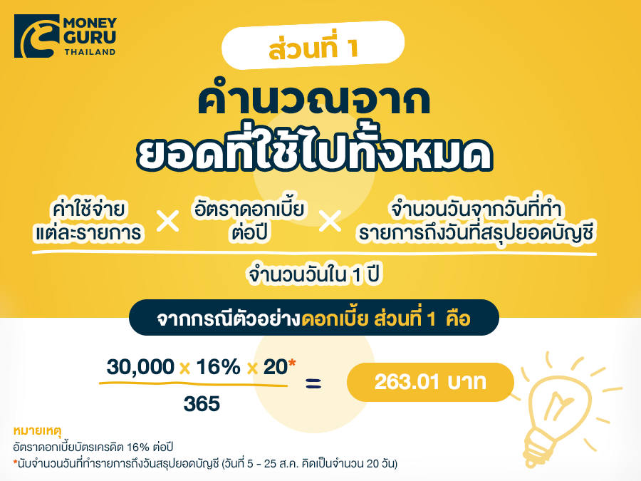 - ส่วนที่ 1 คิดดอกเบี้ยจาก "ยอดใช้จ่ายทั้งหมด" ตั้งแต่วันที่ใช้บัตร ไปจนถึงวันสรุปยอด