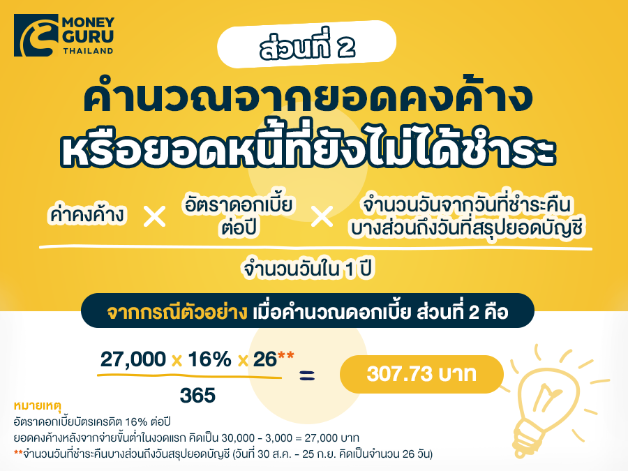 - ส่วนที่ 2 คิดดอกเบี้ยจาก "ยอดที่ยังไม่ได้ชำระ หรือยอดคงค้าง" ตั้งแต่วันที่ชำระขั้นต่ำ ไปจนถึงวันสรุปยอดของเดือนถัดไป