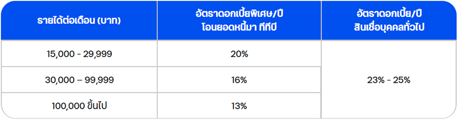- ต้องการลดภาระการชำระหนี้รายเดือน ด้วยการรวมหนี้บัตรทั้งหมดเป็นก้อนเดียว เนื่องจากคนส่วนใหญ่มีบัตรเครดิตมากกว่า 1 ใบ และมียอดใช้จ่ายทุกใบ หากเกิดกรณีที่ใช้จ่ายจนมีหนี้สินพอกพูนไม่สามารถจ่ายไหว ก็ควรที่จะรวมหนี้จากบัตรเครดิตทุกใบ มาเป็นหนี้ก้อนเดียว เพื่อจัดการได้ง่ายขึ้น