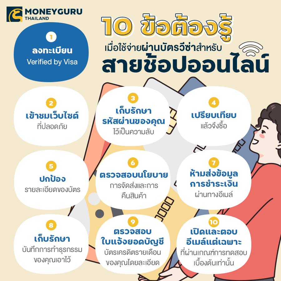 เก็บรักษารหัสผ่านไว้เป็นความลับ หากร้านค้าออนไลน์ขอให้เราลงทะเบียนชื่อผู้ใช้และรหัสผ่านก่อนชำระเงิน เราจะต้องเก็บรหัสผ่าน Verified by Visa ไว้เป็นความลับ ไม่เปิดเผยโดยเด็ดขาด