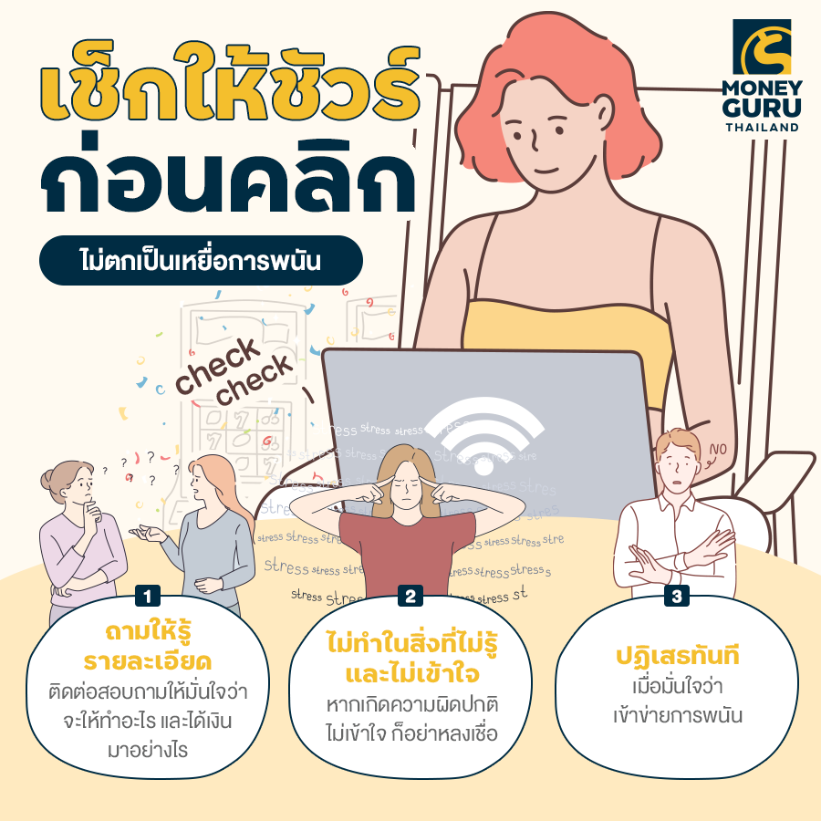ปัจจุบันเครือข่ายออนไลน์ได้รับความนิยมอย่างสูง ไม่ว่าจะทำอะไรก็สามารถคลิกดำเนินการผ่านระบบออนไลน์ได้เลย ไม่เว้นแม้แต่การทำงานพิเศษ หารายได้เสริม หรือการลงทุนในรูปแบบต่างๆ โดยเหล่ามิจฉาชีพพวกนี้จะมาในหลายรูปแบบ เช่น การโฆษณาในสื่อ Social Media ต่างๆ การส่ง SMS หรือแม้แต่การโทรมาชักชวน เป็นต้น แต่สุดท้ายแล้วสิ่งที่ดูจะง่าย แถมได้รับผลตอบแทนมหาศาลนั้น กลายเป็นคำหลอกลวงของพวกเว็บไซต์การพนัน ส่งมาหลอกล่อให้เราหลงเชื่อและเข้าไปเป็นส่วนหนึ่งของการเล่นการพนันนั้น จนทำให้หลายคนหลงเชื่อ ได้รับความเสียหาย บางคนกลายเป็นหนี้มากมายในชั่วพริบตาเดียว เพราะฉะนั้น เพื่อนๆ คนไหนได้รับการเชิญชวนในลักษณะแบบนี้ อย่าเพิ่งเชื่อ และไว้ใจทำธุรกรรมต่างๆ เหล่านี้นะคะ หากเราสนใจจริงๆ ก็เช็กให้ชัวร์ก่อนตัดสินใจทุกครั้ง ซึ่งวันนี้ทางทีมงาน CheckRaka ก็จะขอนำวิธีป้องกันภัยแบบง่ายๆ มาฝากทุกคน ดังนี้ค่ะ