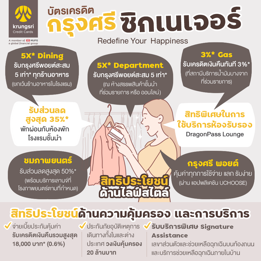 - จำกัดการรับเครดิตเงินคืนสูงสุด 18,000 บาท/บัญชีบัตรหลัก/ปีปฏิทิน สำหรับบัตรเครดิต กรุงศรี ซิกเนเจอร์
