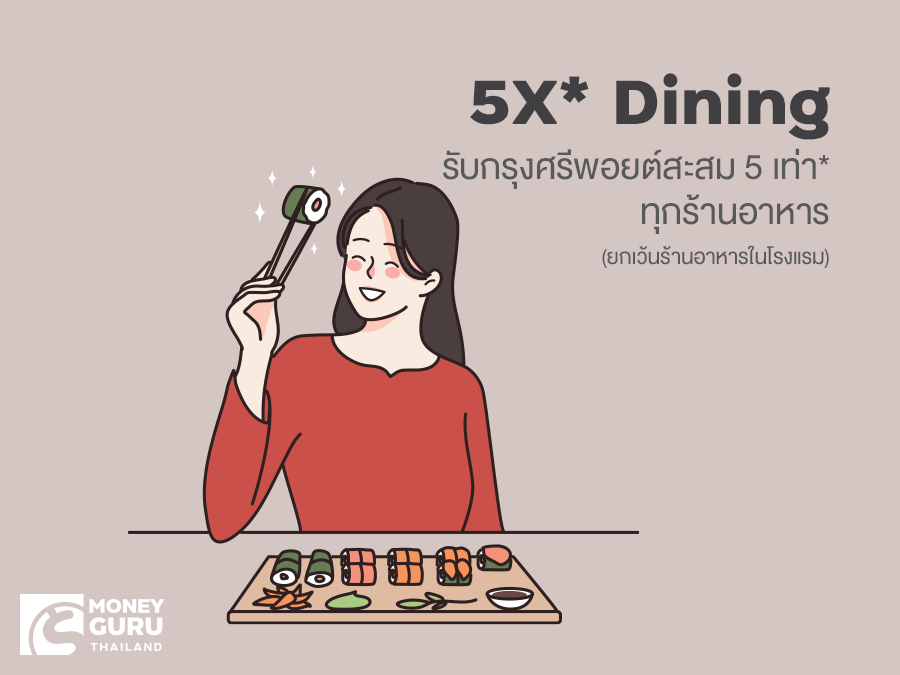 5X* Dining รับกรุงศรีพอยต์สะสม 5 เท่า* ทุกร้านอาหาร (ยกเว้นร้านอาหารในโรงแรม) เมื่อทานครบทุกๆ 2,000 บาท/หมายเลขบัญชีบัตรหลัก/เซลล์สลิป จำกัดสูงสุด 10,000 บาท/หมายเลขบัญชีบัตรหลักบัตร/เดือน