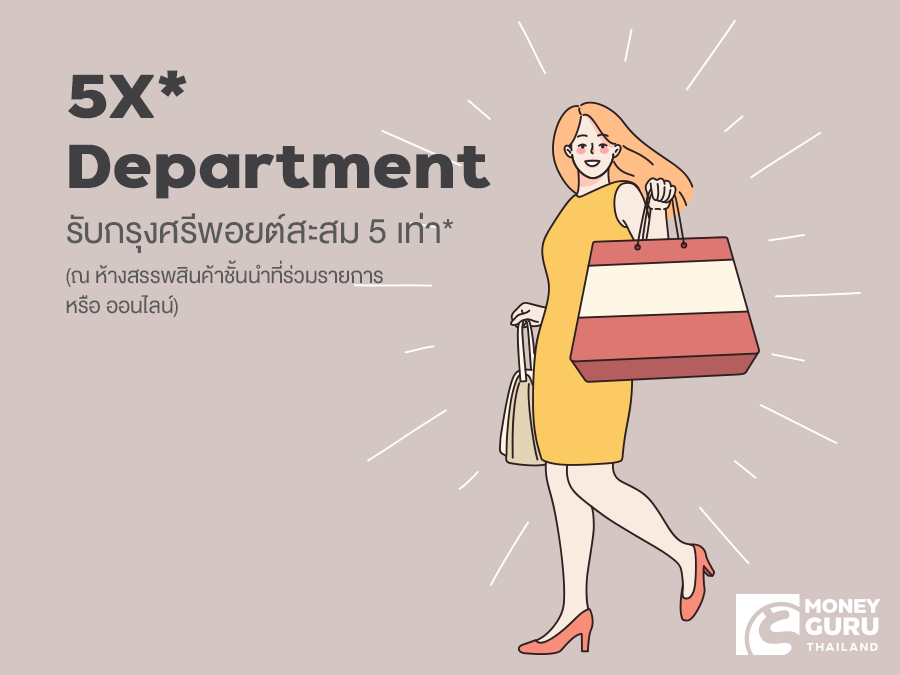 5X* Department รับกรุงศรีพอยต์สะสม 5 เท่า* ณ ห้างสรรพสินค้าชั้นนำที่ร่วมรายการ หรือ ออนไลน์ เมื่อช้อปครบทุกๆ 10,000 บาท/หมายเลขบัญชีบัตรหลัก/เซลล์สลิป จำกัด 4 ครั้ง/หมายเลขบัญชีบัตรหลัก/เดือน
