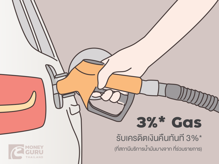3%* Gas ให้ทุกการเดินทางของคุณไม่มีสะดุด รับเครดิตเงินคืนทันที 3%* ที่สถานีบริการน้ำมันบางจาก ที่ร่วมรายการ เมื่อเติมน้ำมันครบทุก 800 บาท/เซลล์สลิป โดยจำกัดเครดิตเงินคืนสำหรับยอดการเติมน้ำมันสูงสุด 4,800 บาทต่อหมายเลขบัตรหลักต่อรอบบัญชี (คำนวณยอดเติมน้ำมันจากทั้งบัตรหลักและบัตรเสริมรวมกัน) และสงวนสิทธิ์ยกเว้นการให้พอยต์สะสม