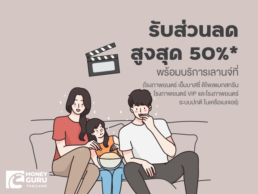 รับส่วนลดสูงสุด 50%* เมื่อซื้อบัตรชมภาพยนตร์ (จำกัด 1 สิทธิ์ (2 ที่นั่ง)/บัญชีบัตรหลัก/เดือน) พร้อมบริการเลานจ์ที่โรงภาพยนตร์ เอ็มบาสซี ดิโพลแมทสกรีน (จำกัด 150 สิทธิ์/เดือน) โรงภาพยนตร์ VIP (จำกัด 150 สิทธิ์/เดือน) และโรงภาพยนตร์ระบบปกติ ในเครือเมเจอร์ตามที่กำหนด (จำกัด 400 สิทธิ์/เดือน)