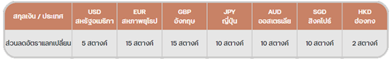 ส่วนลดอัตราแลกเปลี่ยนพิเศษ สำหรับเงินโอนระหว่างประเทศ 7 สกุล สามารถใช้บริการได้ที่ี่ธนาคารทุกสาขา สอบถามเพิ่มเติมได้ที่ โทร. 02-676-8088