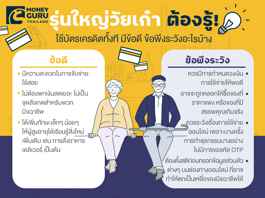 ซึ่งการที่กลุ่มคนวัยเกษียณ ต้องหยุดทำงาน และมาใช้ชีวิตอยู่กับบ้านเฉยๆ ก็อาจจะยังไม่คุ้นชิน และอาจทำให้รู้สึกอึดอัดบ้าง การได้ออกไปเปิดหูเปิดตา และเลือกซื้อของใช้ที่จำเป็นได้ตามที่ต้องการ การไปเที่ยวสังสรรค์กับกลุ่มเพื่อนก็อาจเป็นอีกวิธีหนึ่งที่ช่วยให้รู้สึกผ่อนคลาย และหายเหงาไปได้บ้างนะคะ แต่ก็นั่นแหละค่ะ ถ้าพูดถึงการใช้จ่ายผ่านบัตรเครดิตโดยเฉพาะกับผู้สูงวัยด้วยแล้วก็ยังมีข้อดี และข้อพึงระวังอยู่บ้าง ดังนี้