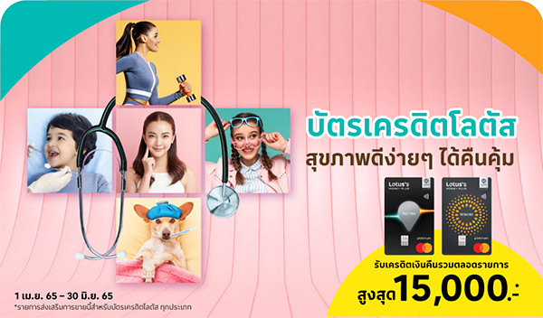 ให้เรื่องสุขภาพความงามของคุณและคนที่คุณรักเป็นเรื่องง่ายๆ เพียงรูดค่าหมอ ค่ายา ค่าสินค้าและบริการที่โรงพยาบาล คลินิกทำฟัน ร้านขายยา ร้านแว่นตา คลินิกเสริมความงาม ฟิตเนส โยคะ สปา และโรงพยาบาลสัตว์ ก็ได้รับเครดิตเงินคืนตลอดรายการรวมสูงสุด 15,000 บาท*