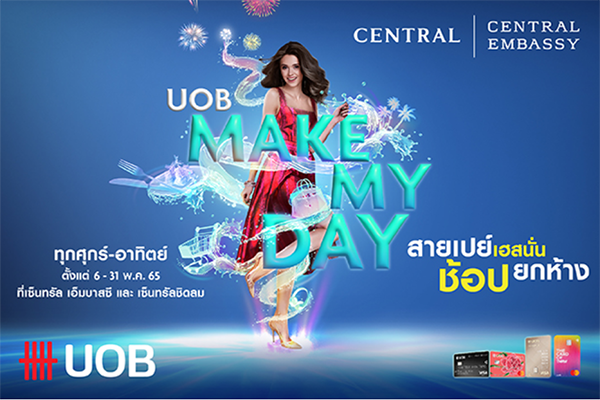 สายเปย์ สายช้อป ต้องโดนใจกับโปรโมชัน UOB Make My Day สายเปย์เฮสนั่น ช้อปยกห้าง ณ ร้านค้าภายในศูนย์การค้าและห้างสรรพสินค้าเซ็นทรัล เอ็มบาสซี และเซ็นทรัล ชิดลม ทุกวันศุกร์-เสาร์-อาทิตย์ ระหว่างวันที่ 6 พ.ค. 65 – 31 พ.ค. 65