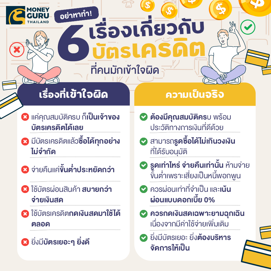พอได้เห็นสถาบันการเงินหลายๆ แห่งทยอยกันจัดโปรโมชั่นสำหรับลูกค้าที่ถือบัตรเครดิต ก็อดไม่ได้ที่อยากจะสมัครบัตรเครดิตสักใบ เพราะอยากจะเป็นส่วนหนึ่งที่ได้รับสิทธิพิเศษเหล่านั้นไปกับเขาด้วย ทั้งได้เงินคืน ได้ส่วนลด ได้คะแนนสะสมไปแลกของรางวัลต่างๆ แล้วยังได้ไมล์สะสมไปแลกเที่ยวบินอีก สิทธิประโยชน์จัดเต็มชนิดที่ว่าถ้าใช้เงินสดจ่ายเพียงอย่างเดียวคงไม่ได้รับอะไรแบบนี้แน่ๆ แต่ความคุ้มค่าเหล่านี้ต้องแลกมาด้วยวินัยที่ดีในการใช้บัตรด้วยนะคะ หลายๆ คนที่ใช้เพลินจนกลายเป็นหนี้กองโตก็มีให้เห็นกันมาแล้ว สาเหตุก็เป็นเพราะมีความเข้าใจผิดๆ ในการใช้นี่แหละค่ะ ซึ่งถือว่าเป็นสาเหตุหลักที่นำไปสู่การเป็นหนี้เลย แล้วเรื่องที่คนมักจะเข้าใจผิดกันเกี่ยวกับบัตรเครดิตจะมีอะไรบ้าง เรามาดูกันค่ะ