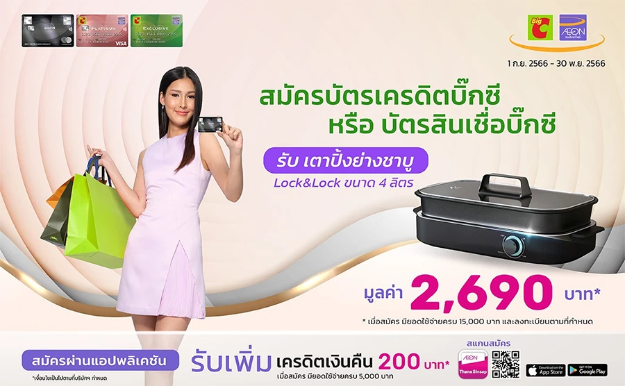 - รับเครดิตเงินคืน 200 บาท สำหรับลูกค้าที่สมัครบัตรเครดิตบิ๊กซี เวิลด์ มาสเตอร์การ์ด ผ่าน AEON THAI MOBILE Application เมื่อมียอดใช้จ่ายสะสมผ่านบัตรครบ 5,000 บาท ภายใน 60 วัน นับจากวันที่ได้รับอนุมัติบัตร (ทั้งนี้ไม่รวมถึงการสมัครโดยผ่านคอมพิวเตอร์ที่สาขา และแท็บเล็ตที่สาขา)