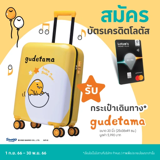 สมัครบัตรเครดิตโลตัส ผ่านเว็บไซต์ รับกระเป๋าเดินทาง Gudetama ขนาด 20 นิ้ว มูลค่า 5,990 บาท เมื่อใช้จ่ายสะสม 12,000 บาทขึ้นไป ภายใน 60 วัน นับจากบัตรอนุมัติ หรือเมื่อสมัครรับใบแจ้งยอดบัญชีอิเล็กทรอนิกส์ (e-statement) และใช้จ่ายสะสมเพียง 10,000 บาทขึ้นไป ภายใน 60 วัน นับจากบัตรอนุมัติ