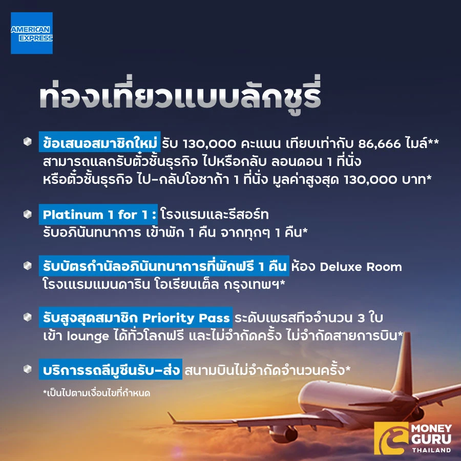 เพียงสมัครบัตรแพลทินัม อเมริกันเอ็กซ์เพรส ก็ได้เที่ยวหรูอยู่สบาย รับอภินันทนาการเข้าพัก 1 คืน จาก ทุกๆ 1 คืน ที่ชำระค่าห้องพัก เมื่อเข้าพักในโรงแรมที่ร่วมรายการ ประหยัดสูงสุด 100,000 บาท/การเข้าพัก 2 คืน* ตัวอย่างโรงแรมที่ร่วมรายการ เช่น The Capella กรุงเทพฯ, The Standard มัลดีฟส์, Villa Mahabhirom เชียงใหม่, Keemala ภูเก็ต, Dusit Hotels and Resorts ทั่วโลก, Park Hyatt กรุงเทพฯ, The Okura Prestige กรุงเทพฯ, Intercontinental Resort พัทยา ฯลฯ