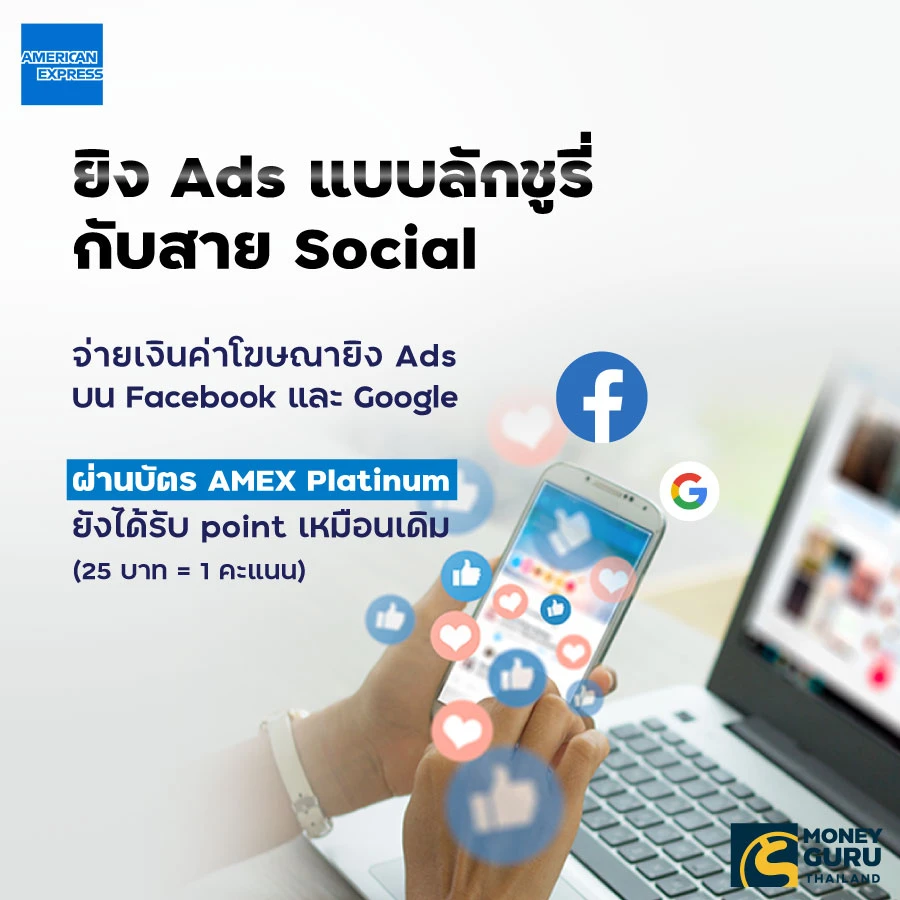 สำหรับสาย Social หากจ่ายเงินค่าโฆษณายิง Ads บน Facebook และ Google ผ่านบัตร AMEX Platinum จะยังได้รับ point เหมือนเดิมคือ อยู่ที่ 25 บาท = 1 คะแนน