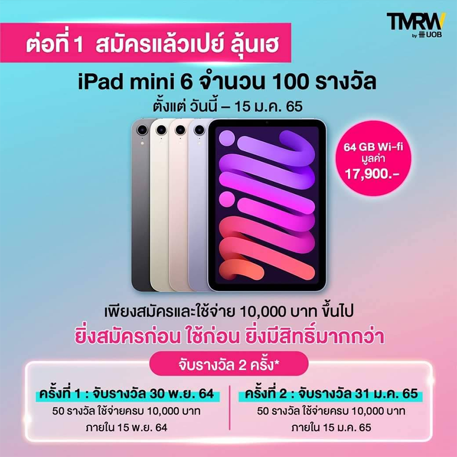ต่อที่ 1 : สมัครแล้วเปย์ ลุ้นเฮ iPad mini 6 จำนวน 100 รางวัล* โปรสำหรับลูกค้าที่สมัครบัตรเครดิต TMRW ระหว่างวันที่ 11 ต.ค 64 - 31 ธ.ค. 64 และใช้จ่ายผ่านบัตรเครดิต TMRW ตั้งแต่ 10,000 บาทขึ้นไป ระหว่างวันที่ 11 ต.ค. 64 - 15 ม.ค 65 มีสิทธิ์ลุ้นรับ iPad mini 6 Wi-Fi 64 GB มูลค่า 17,900 บาท จำนวน 100 รางวัล จับรางวัล 2 ครั้ง ยิ่งสมัครก่อน ใช้ก่อน ยิ่งมีสิทธิ์มากกว่า