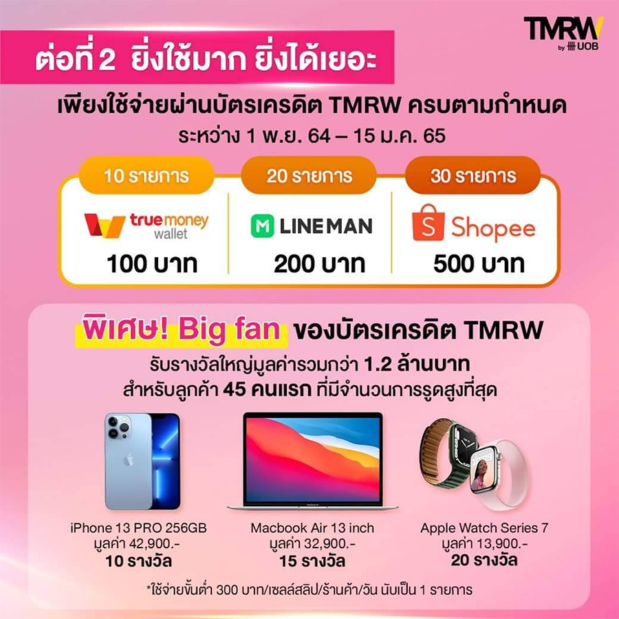 ต่อที่ 2 : ยิ่งใช้มาก ยิ่งได้เยอะ ไม่ต้องลุ้น** โปรสำหรับลูกค้าบัตรเครดิต TMRW ที่ใช้จ่ายผ่านบัตรเครดิต TMRW ระหว่างวันที่ 1 พ.ย. 64 - 15 ม.ค. 65 ตามจำนวนรายการที่กำหนด โดยมีการใช้จ่ายขั้นต่ำ 300 บาท/เซลล์สลิป/ร้านค้า/วัน