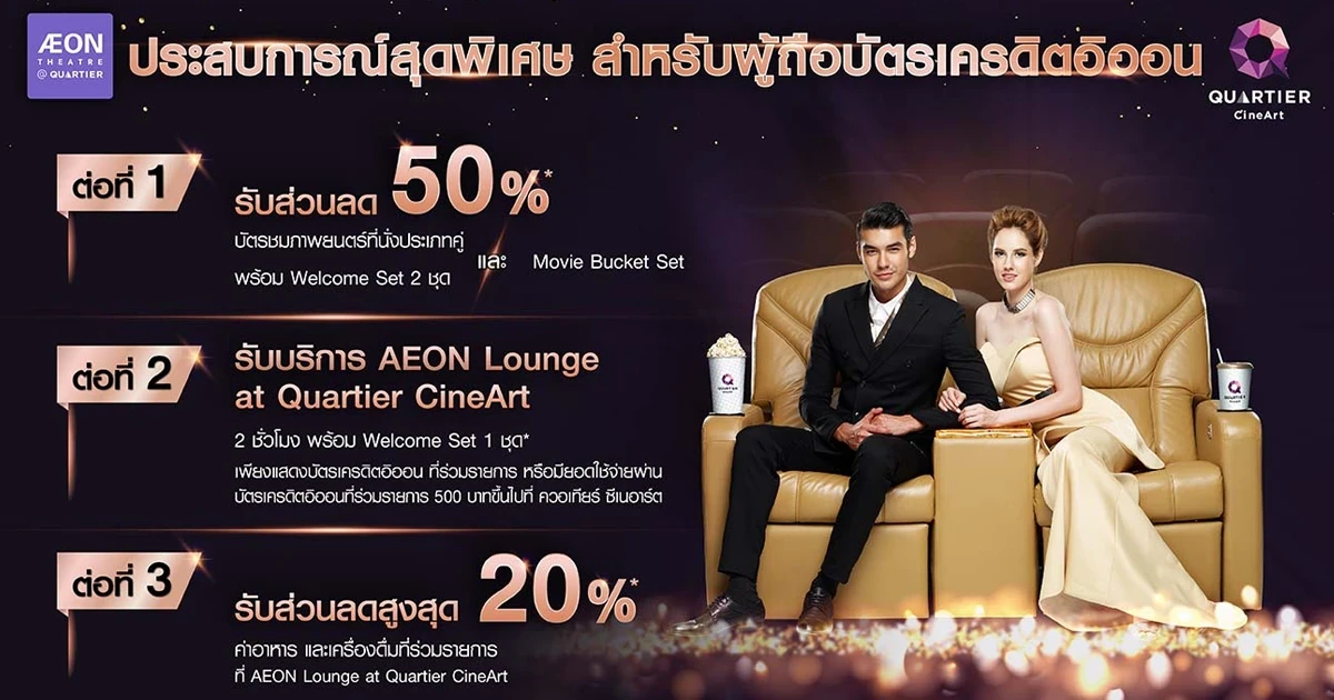 - สิทธิพิเศษที่ AEON Lounge at Quartier CineArt : รับสิทธิ์ใช้บริการ AEON Lounge at Quartier CineArt (2 ชั่วโมง) พร้อมรับ Welcome Set 1 ชุด กับบัตรเครดิตอิออน รอยัล ออร์คิด พลัส, บัตรเครดิตอิออน โกลด์, บัตรเครดิต วีซ่า โอลิมปิก อิออน, บัตรเครดิตอิออนคลาสสิค, บัตรเครดิตอิออน เจ-พรีเมียร์ แพลทินัม และบัตรเครดิตอิออนคลับไทยแลนด์ เมื่อชำระค่าบัตรชมภาพยนตร์ 500 บาทขึ้นไป/สลิป ที่ควอเทียร์ซีเนอาร์ต (1 เซลล์สลิป/ 1 สิทธิ์) จำกัด 2 สิทธิ์ / บัตร / วัน (นำผู้ติดตามเข้าได้ไม่เกิน 1 ท่าน)