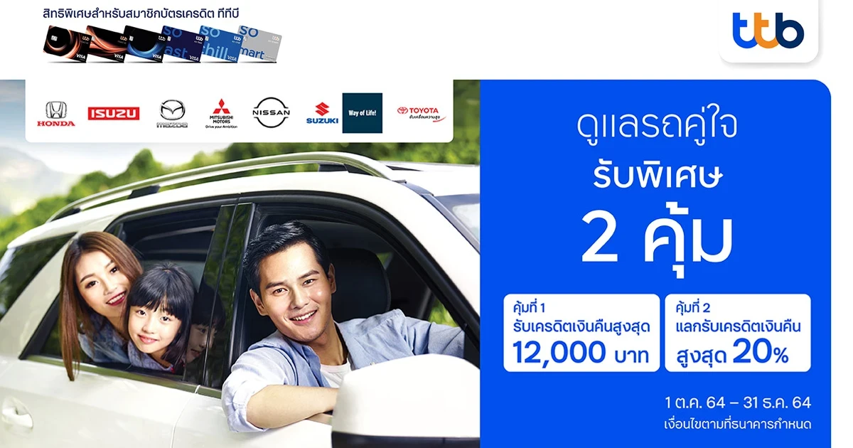 - เฉพาะผู้ถือบัตรเครดิตทีทีบี บัตรเครดิตทีเอ็มบี บัตรเครดิตธนชาต ประเภทบัตรสำหรับบุคคลธรรมดาเท่านั้น ที่มียอดใช้จ่ายผ่านบัตรเครดิตแบบเต็มจำนวนต่อเซลล์สลิปและลงทะเบียนถูกต้องตามเงื่อนไข ณ ศูนย์บริการผู้แทนจำหน่ายอย่างเป็นทางการของแบรนด์รถยนต์ที่ร่วมรายการ ได้แก่ ฮอนด้า, อีซูซุ, มาสด้า, มิตซูบิชิ, นิสสัน, ซูซุกิ, และ โตโยต้า ระหว่างวันที่ 1 ตุลาคม 2564 - 31 ธันวาคม 2564