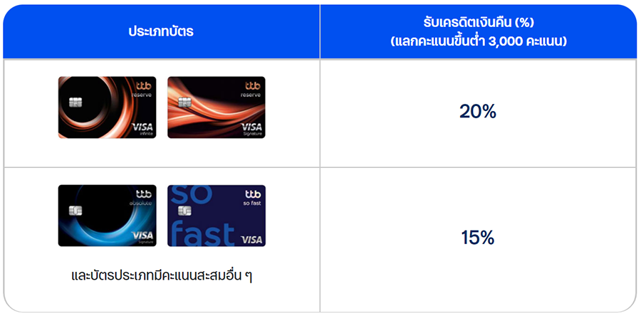 - บัตรเครดิตทีทีบี ทีเอ็มบี และธนชาต และประเภทที่มีคะแนนคะแนนสะสมอื่น ๆ รับเครดิตเงินคืน 15% ต่อการแลกคะแนนขึ้นต่ำ 3,000 คะแนน