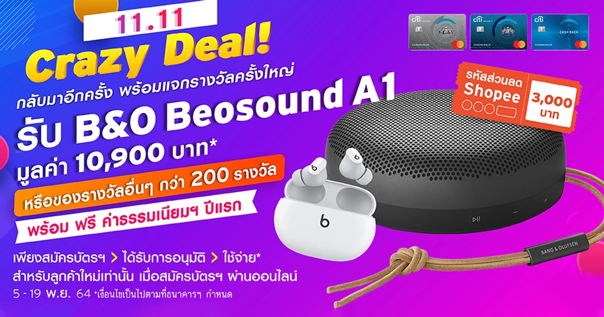 - ผู้ที่จะได้รับ B&O BT Speaker Beosound A1 2nd Gen มูลค่า 10,900 บาท หรือ หูฟัง Beats Studio Buds True Wireless ANC มูลค่า 5,500 บาท หรือ รหัสส่วนลดช้อปปี้ (Shopee) มูลค่า 3,000 บาท จะไม่มีสิทธิ์ได้รับโปรโมชั่นสำหรับการสมัครบัตรเครดิตซิตี้ผ่านช่องทางออนไลน์อื่น
