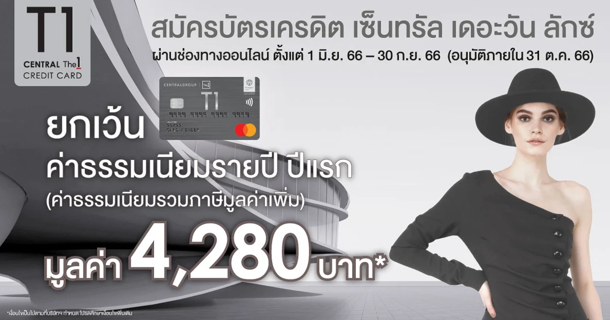 สมัครบัตรเครดิต เซ็นทรัล เดอะวัน ลักซ์ ผ่านช่องทางออนไลน์ (รวมแอปพลิเคชัน UCHOOSE) ยกเว้นค่าธรรมเนียมรายปี ปีแรก มูลค่า 4,280 บาท (ค่าธรรมเนียมรวมภาษีมูลค่าเพิ่ม)