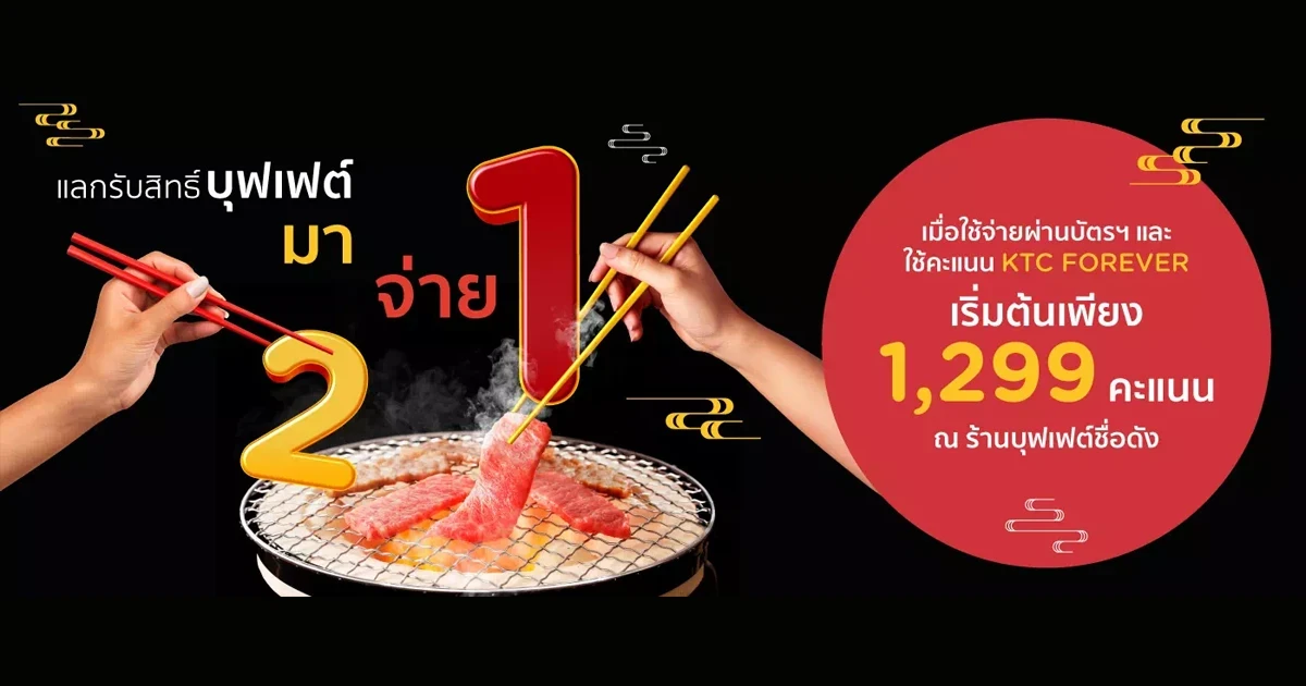 อิ่มไม่อั้น เอาใจคนรักบุฟเฟต์ โปรสุดคุ้ม บุฟเฟต์มา 2 จ่าย 1 กับบัตรเครดิต KTC เมื่อใช้จ่ายผ่านบัตรฯ และใช้คะแนน KTC Forever เริ่มต้นเพียง 1,299 คะแนน ณ ร้านบุฟเฟ่ต์ชื่อดังที่ร่วมรายการกว่า 60 ร้าน