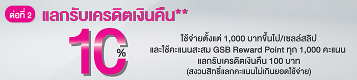 ต่อที่ 2 แลกรับเครดิตเงินคืน 10% เมื่อใช้จ่ายตั้งแต่ 1,000 บาทขึ้นไป/เซลล์สลิป และใช้คะแนนสะสม GSB Reward Point ทุก 1,000 คะแนน แลกรับเครดิตเงินคืน 100 บาท (สงวนสิทธิ์แลกคะแนนไม่เกินยอดใช้จ่าย)