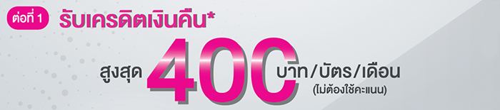 ต่อที่ 1 รับเครดิตเงินคืนสูงสุด 400 บาท/บัตร/เดือน (ไม่ต้องใช้คะแนน)