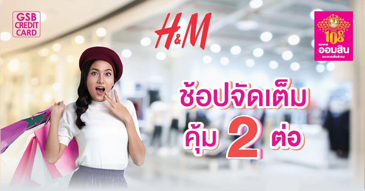 - เมื่อใช้จ่ายผ่านบัตรเครดิตธนาคารออมสิน ณ ร้าน H&M สาขาที่ร่วมรายการ หรือ www.th.hm.com ตั้งแต่ 1,000 บาทขึ้นไป/เซลล์สลิป และใช้คะแนนสะสม GSB Reward Point ทุก 1,000 คะแนน แลกรับเครดิตเงินคืน 100 บาท