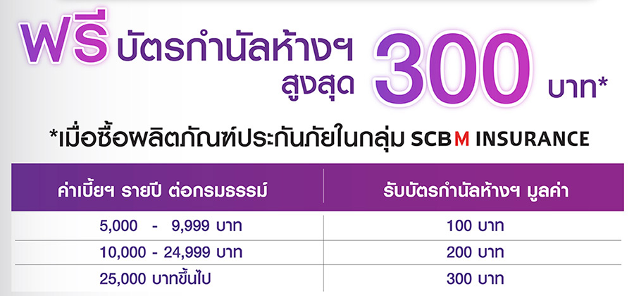 สิทธิพิเศษ 1 รับฟรี! บัตรกำนัลห้างฯ มูลค่าสูงสุด 300 บาท เมื่อซื้อผลิตภัณฑ์ประกันภัยในกลุ่ม SCB M INSURANCE ค่าเบี้ยฯ รายปีตามที่กำหนด ดังนี้