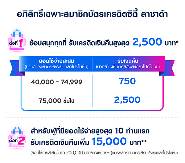 - จำกัดการให้เครดิตเงินคืนสูงสุด 15,000 บาท/ระยะเวลาโปรโมชั่น/บัญชีบัตรฯ (บัตรหลักและบัตรเสริมรวมกัน) และจำกัดสิทธิ์รวมทั้งหมด 10 สิทธิ์ ตลอดรายการ