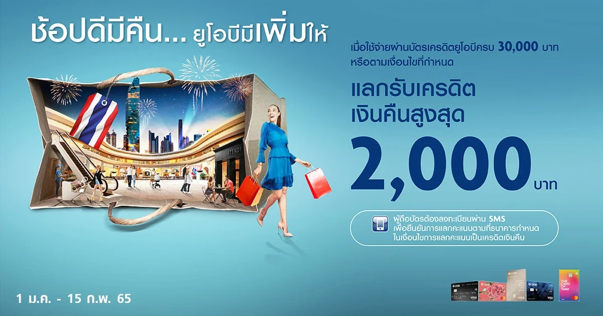 - รายการส่งเสริมการขายนี้ระหว่างวันที่ 1 มกราคม 2565 – 15 กุมภาพันธ์ 2565เฉพาะบัตรเครดิตยูโอบีที่ออกในประเทศไทยเท่านั้น (ยกเว้นบัตรเครดิตเพื่อธุรกิจ) โดยผู้ถือบัตรจะต้องคงสถานะการเป็นสมาชิกบัตรและไม่ผิดนัดชำระเงินจนถึงวันที่ธนาคารบันทึกเครดิตเงินคืนเข้าบัญชีบัตรเครดิต