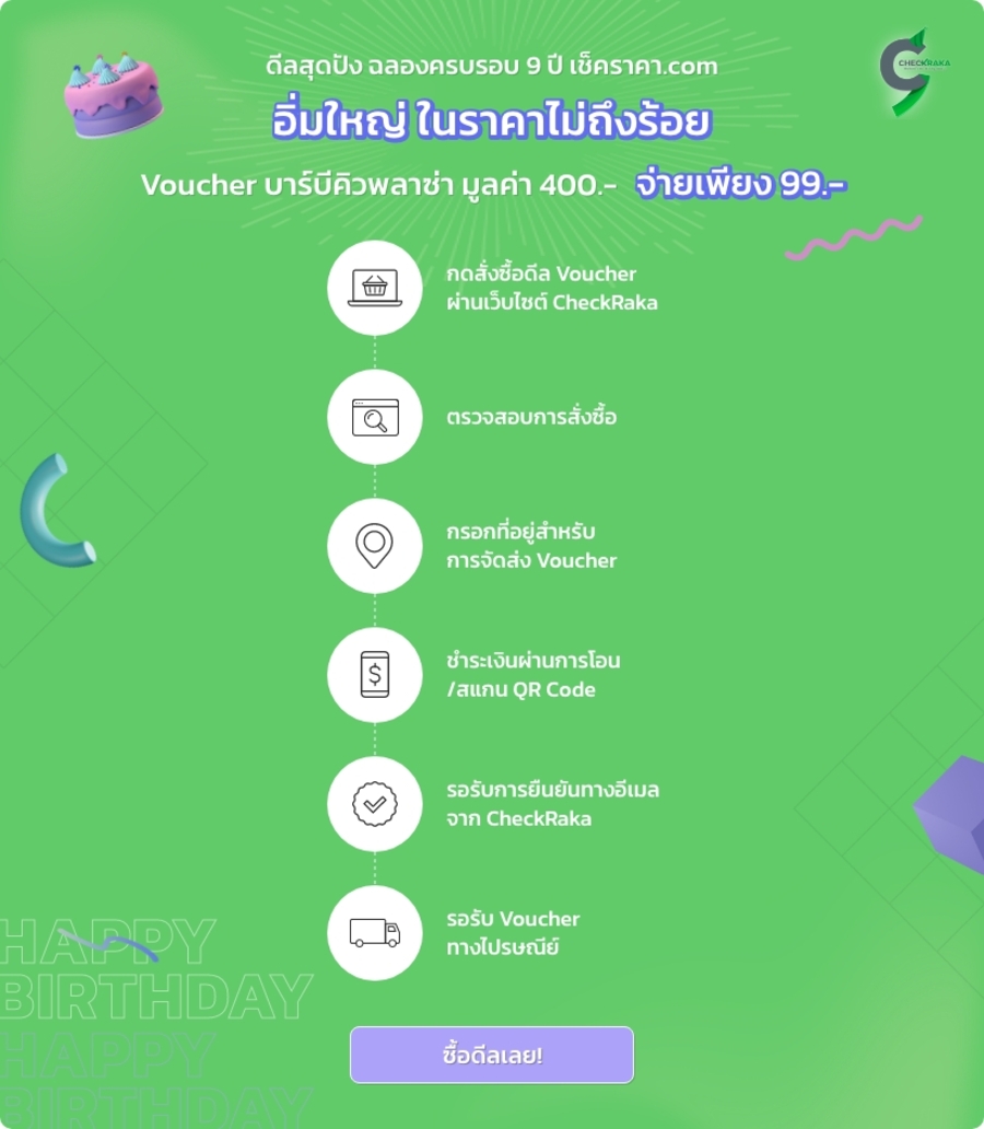 เช็คราคา.com ฉลองวันเกิดครบรอบ 9 ปี จัดดีล BBQ Plaza มาให้คุณได้อิ่มใหญ่ ในราคาไม่ถึงร้อย! เพียงสั่งซื้อดีลที่เช็คราคา จ่ายเพียง 99.- แต่ได้มูลค่าถึง 400.-