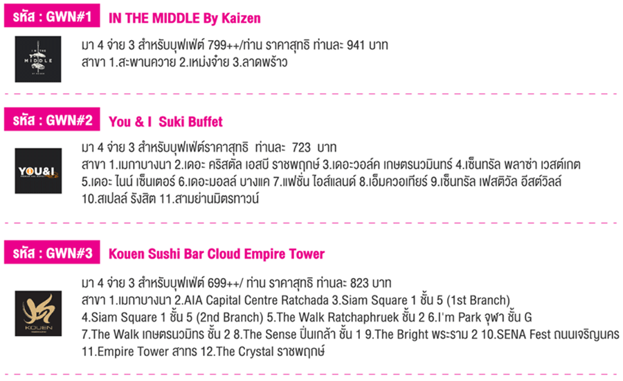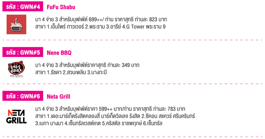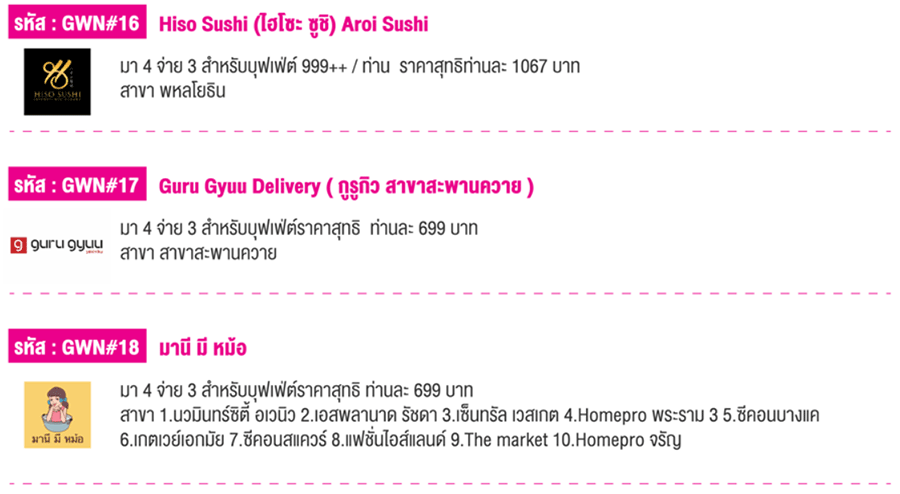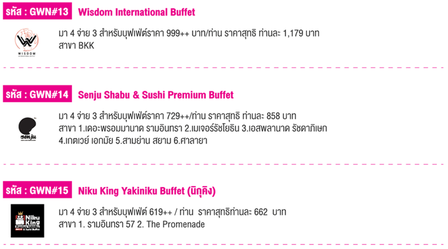 สิทธิพิเศษสำหรับลูกค้าบัตรเครดิตธนาคารออมสิน มา 4 จ่ายแค่ 3 ท่าน สำหรับบุฟเฟต์ ณ ร้านค้าที่ร่วมรายการกว่า 20 ร้านค้าโดยวงใน