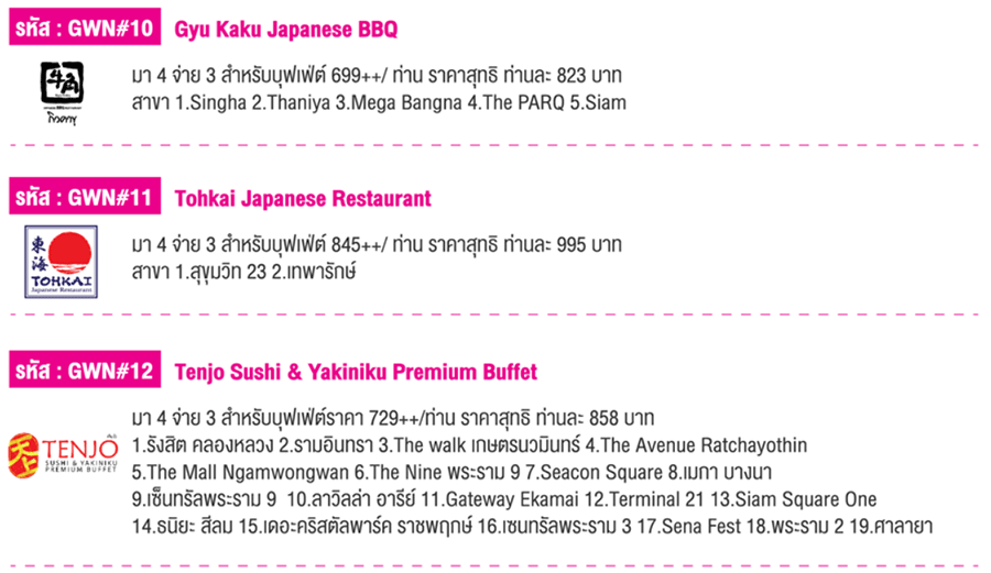 | Tenjo Sushi & Yakiniku Premium Buffet | 12 | 858 บาท |