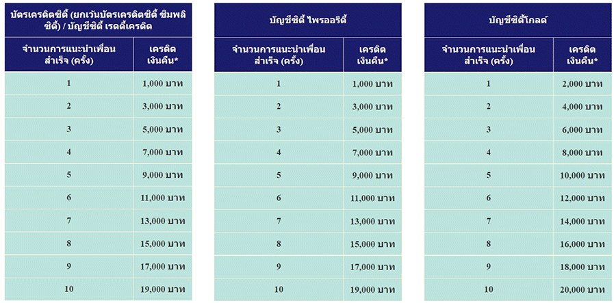 - ข้อเสนอพิเศษ สําหรับผู้ถูกแนะนำจากช่องทางออนไลน์ รับเครดิตเงินคืนเพิ่มอีก 500 บาท เมื่อมียอดใช้จ่าย ผ่านบัตรฯ หรือบัญชีฯ อย่างน้อย 1 รายการภายใน 30 วัน หลังบัตรฯ หรือบัญชีได้รับการอนุมัติ (ในกรณีที่ผู้ถูกแนะนํา 1 คน ได้รับอนุมัติมากกว่า 1 บัตรฯ/บัญชีฯ ผู้ถูกแนะนําจะได้รับเครดิตเงินคืนสูงสุด 500 บาท)