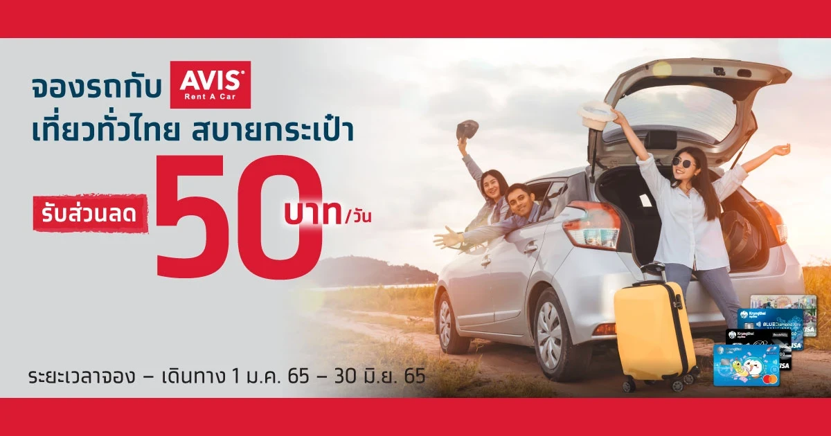 - สิทธิพิเศษตามรายการส่งเสริมการขายนี้ สำหรับลูกค้าผู้ถือบัตรเดบิตกรุงไทย ทุกประเภท และ Krungthai Travel VISA Card ยกเว้นบัตรเดบิต Krungthai FUN (“ลูกค้า”) ของธนาคารกรุงไทย จำกัด (มหาชน) (“ธนาคาร”) เมื่อเช่ารถกับ AVIS Rent A Car ประเทศไทย (“ผู้ให้บริการ”) รับส่วนลด 50 บาท/วัน (จากราคาหน้าเว็บไซต์หลักในช่วงเวลานั้น) ตามเงื่อนไขที่กำหนด